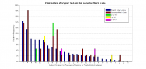 Of particular interest in the above graph is the frequency of the letter "R", which occurs noticeably more than any other letter. This, combined with the fact that "R" only appears once in the Somerton Man's code, suggests the code is not a meaningless random set of letters, but as the sample set used to date is only 11, this is not yet conclusive.