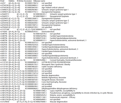 With the support of data mining program, 613905 SNPs were searched in the database and 574 diseases were found. Figure 5.2 shows part of the genetic diseases outputs. As the figure shown, the program would record the rsid of SNP that the disease belonged to in rsid column. And column alleles present the change of nucleotide change of the SNPs. Moreover, dbSNP only provide a brief description of the clinical effects. More details are linked to another database called ClinVar which is a freely accessible, public database that provide medical reports of the relationships among human variants and phenotypes [12]. Therefore ClinVar Accession column is introduced to collect the ID of the recorded disease. This ID linked to the Clinvar database and allow the user to find a detailed medical report about the disease. Last but not least, the diseases names are recorded in disease name column. It is necessary to indicate that there are multiple diseases named with 'not specified' or 'not provided' which would require the user to find a detailed description of the disease in Clinvar. Unfortunately, none of diseases in the results relates or corresponds to Somerton Man's known appearance.